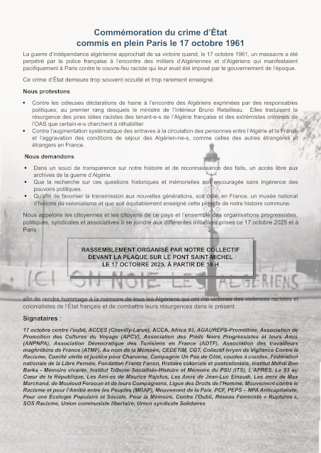 17 octobre contre l’oubli, ACCES (Chevilly-Larue), ACCA, AFPS Paris-Sud, Africa 93, AGAUREPS-Prométhée, Association Josette et Maurice Audin (AJMA), AMFPGN, AMF, APAREDESA, Apel-Égalité, Association de Promotion des Cultures du Voyage (APCV), Association des Médecins pour la Prévention de la Guerre Nucléaire (AMPGN), Association des Pieds Noirs Progressistes et leurs Amis (ANPNPA), Association Démocratique des Tunisiens en France (ADTF), ASTI de Colombes, ATTAC France, ATMF, Au nom de la Mémoire, CEDETIM, CGT, CISE, CISPM, Collectif Boycott Apartheid Israël Paris-Banlieue, Collectif Faty KOUMBA, Collectif Ivryen de Vigilance Contre le Racisme, Collectif le PONT Martigues 13, collectif Sövkipeu, Collectif Unitaire Franco-Algérien de l’Île de France, Comité vérité et justice pour Charonne, Compagnie Un Pas de Côté, Coordination nationale Pas sans Nous, COPAF, coudes à coudes, CRID, DIEL, Euro Palestine, FASTI, Fédération nationale de la Libre Pensée, Fondation Frantz Fanon, FSE, FTCR, Histoire coloniale et postcoloniale, Institut Mehdi Ben Barka - La Cimade, Mémoire vivante, Institut Tribune Socialiste-Histoire et Mémoire du PSU (ITS), Jeunes Insoumis-es, JSJV, L’APRES, La Cimade, La Marche des Solidarités, Le 93 au Cœur de la République, Le Poing Levé, Les Ami-es de Maurice Rajsfus, Les Amis de Jean-Luc Einaudi, Les amis de Max Marchand - de Mouloud Feraoun et de leurs Compagnons, LDH, LDH Auxerre, LDH EHESS, Les Amoureux au ban public, Memorial 98, Mouvement contre le Racisme et pour l’Amitié entre les Peuples (MRAP), Morlaix Libertés, Mouvement de la Paix, Mouvement des Progressistes, PCF, PEPS, NPA Anticapitaliste, Palestine Vivra !, Pour une Écologie Populaire et Sociale, Pour la Mémoire - Contre l’Oubli, RAAR, Renouveau Syndical, RESOCI-Algérie-Point-com, Réseau Féministe « Ruptures », Révolution Permanente, ROSMERTA, SNPES.PJJ-FSU, Solidaires Étudiant-e-s, Solidarités Asie France, SOS Racisme, Survie, Union étudiante, UJFP, Union communiste libertaire, Union syndicale Solidaires, Utopia 56,...