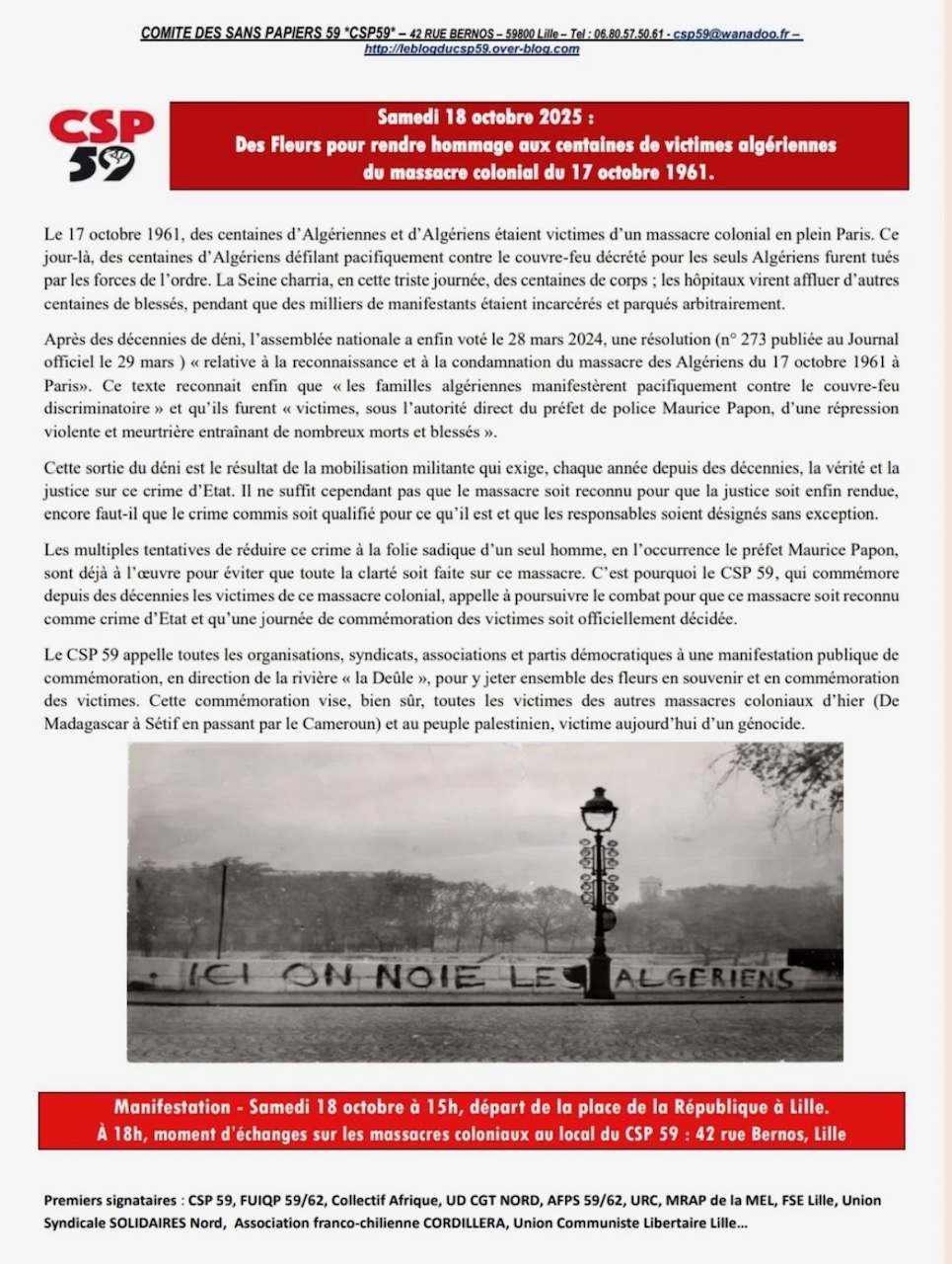 – Besançon : Rassemblement 17 octobre sur le pont Battant à 17h30 - des fleurs seront lancées dans le Doubs